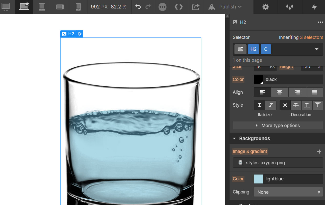 Utility classes can be strung together to behave as the sum of their parts. Using the above example, if we combine <class>H2<class> and <class>O<class>, we'll end up with the bubble background image on top of a blue background, combining to represent the appearance of water.