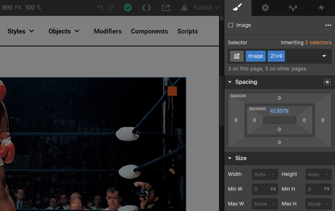 The parent div acts as a canvas for the image, describing the bounding box and desired aspect ratio. The <class>Image<class> sets overflow to hidden and position to relative, since the image will be positioned absolutely inside the div. And a subclass defines the aspect ratio of the image using top padding in percentage units.